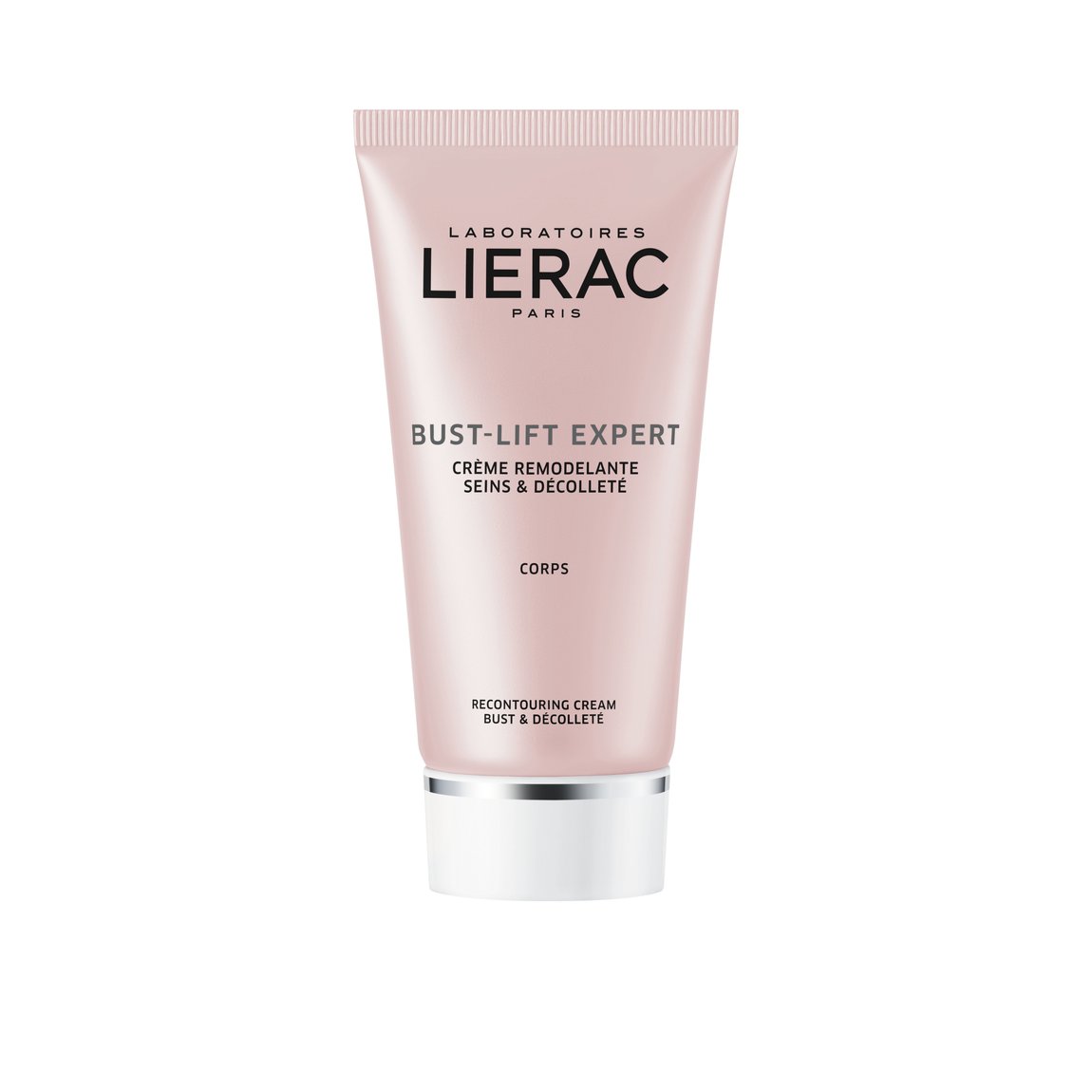 Tubo rosa claro de creme remodelante para busto e decote da Lierac com tampa branca e detalhes prateados