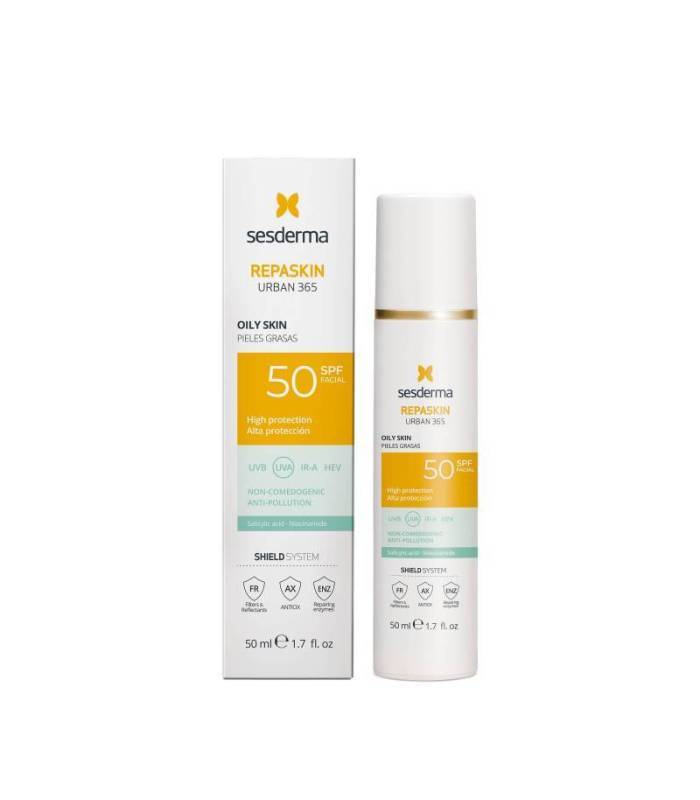 Protector solar Sesderma Repaskin Urban 365 SPF 50 para pele oleosa em frasco branco e embalagem caixa